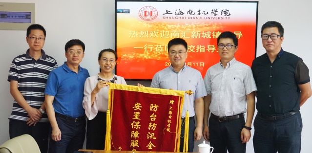 9月11日,南汇新城镇副镇长刘军、王炯彦一行来校调研,为学校送来锦旗,学校王志恒副校长携后勤处、保卫处有关负责人接待。