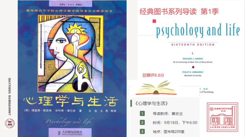 本期导读的图书为马克思主义学院黄志兰老师推荐的《心理学与生活》,黄老师在导读的过程中,首先阐述了这本图书对于学习心理学是一本很好的教材的道理,并从如何使用这本书、为什么要学心理学,理顺了心理学理论流派的发展,从关注个体的、不正常的到关注整体的、健康的、幸福的心理学的转变,让同学们关注自己和身边人的身心健康,通过学习心理学大家更加了解自己和了解他人,指导同学通过学习心理学获得幸福感。