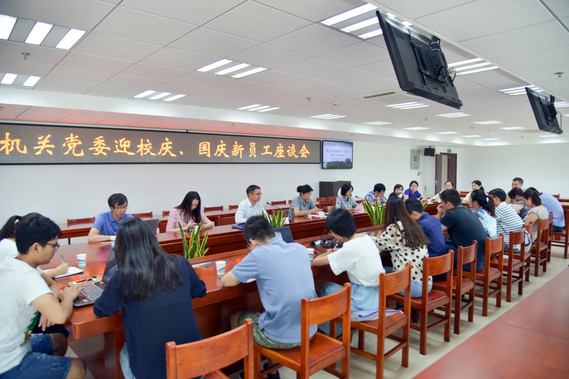 2018年9月25日上午,机关党委在图书馆616会议室举行机关党委新员工迎国庆、迎校庆座谈会。党委副书记、工会主席杨若凡,机关党委书记范冬姣,机关党委各相关职能部门负责人及部门近三年新进员工参加了座谈会。会上,范冬姣介绍了机关党委各部门的简要情况及支部建设情况。到会的16名新员工围绕自身的基本情况、兴趣爱好、工作期望等逐一进行了自我介绍。各部门负责人对新员工的加入表示了热烈的欢迎。