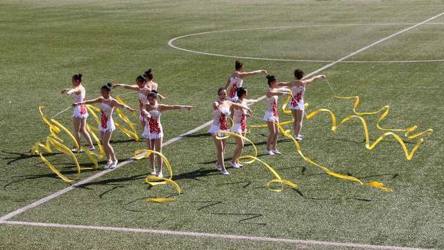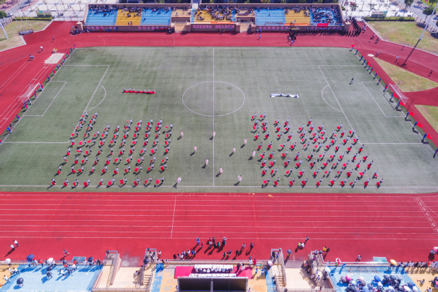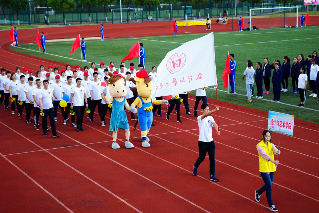 在国旗、校旗、红旗队的引领下,由各个二级学院1300余名学生组成的9支方队和36名师生组成的红旗队,身着缤纷靓丽的运动服装,随着雄壮欢快的《运动员进行曲》,迈着整齐、矫健的步伐,精神抖擞地依序步入田径场,接受主席台领导及看台上师生的检阅,赢得了田径场内外全体师生的热烈掌声。当设计与艺术学院方队达达马携神秘“女子”闪现主席台时,更为运动会开幕式增添了精彩瞬间。