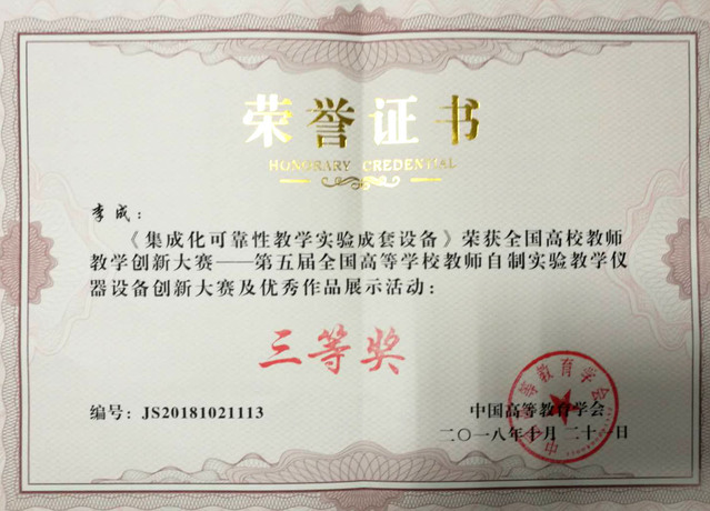 第五届全国高校教师自制实验教学仪器设备创新大赛由中国高等教育学会主办,是全国高校教师教学创新大赛的实验创新部分,旨在调动广大教师参加实验教学改革和实验技术研究的积极性,提升教师的教学能力和业务水平。大赛自2018年6月启动以来,获得了广泛关注,大赛组委会专家组对报名作品进行了初赛网评,评审出249件作品,获得决赛入围资格。我校商学院李成副教授自主研发的“集成化可靠性教学实验成套设备”入围决赛,参加了10月19日至21日在成都举办的中国高等教育博览会中的“第五届全国高等学校教师自制实验教学仪器设备创新大赛及优秀作品展览”,经过现场展示、专家评审,荣获三等奖。