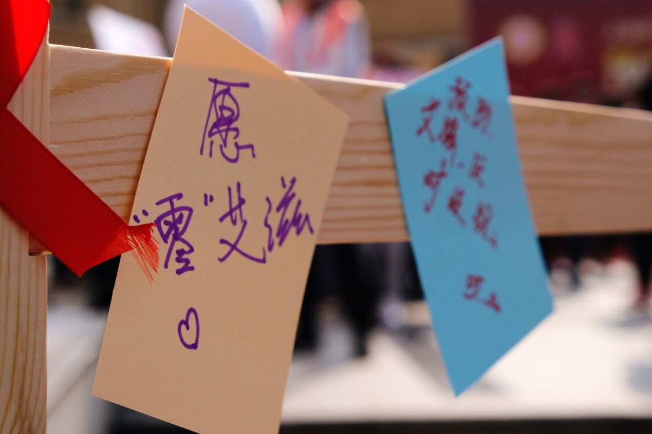 在活动现场的采访中一位同学说道:“一纸卡片写祝福,一个拥抱化尴尬,一句话语暖人心,通过今天的活动,我进一步了解了艾滋,将会做一个防艾的传播者”。