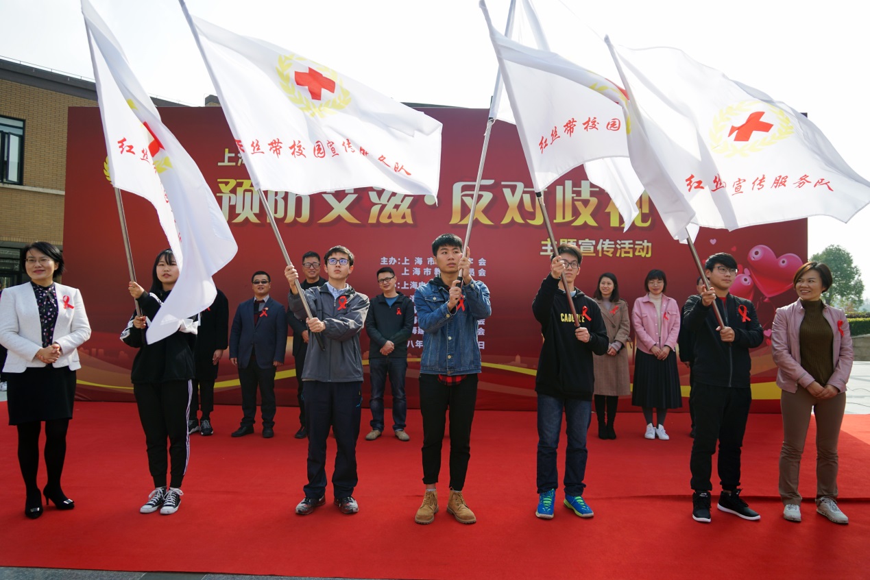 在防艾、反歧视这条路上已经有很多默默付出的同学,接下来李江英向荣获2018年上海市高校 “红十字防艾之星”的获奖同学颁奖。颁奖环节,主持人就有关预防艾滋工作采访了获奖的淮瑶同学,她表示在参加同伴教育小课堂等活动中既学会了很多知识,锻炼了自己的能力,又可以用自己的力量去感染身边的人,使防艾的力量更加强大。紧接其后的是授旗仪式,李江英、顾赛花为临港五校“红丝带”校园宣传服务队授旗,接过了旗帜,就意味着接过了光荣和使命,同学们也将继续把预防艾滋·反对歧视工作进行到底。