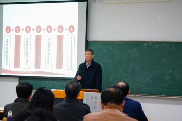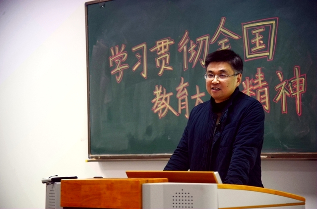 12月13日,校长胡晟在商学院楼521会议室为商学院全体教职工作全国教育大会精神宣讲报告。会上,胡晟点明了本次全国教育大会的特殊性,为新时代我国教育改革指明了方向,具有划时代的意义。他提出,面对我国教育“大而不强”的现状,围绕培养什么人、怎样培养人、为谁培养人这一根本问题,需要加强党对教育工作的领导,坚持立德树人,坚持社会主义办学方向,坚持深化教育改革创新,培养德智体美劳全面发展的社会主义建设者和接班人。结合本次审核评估专家组的反馈意见,胡晟着重分析了学校在进一步发展中所存在的短板,并希望各位老师继续努力,共同推进教学科研工作向前发展,助力学校早日实现“大学梦”。