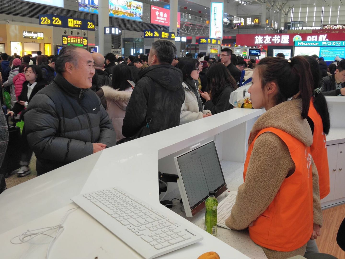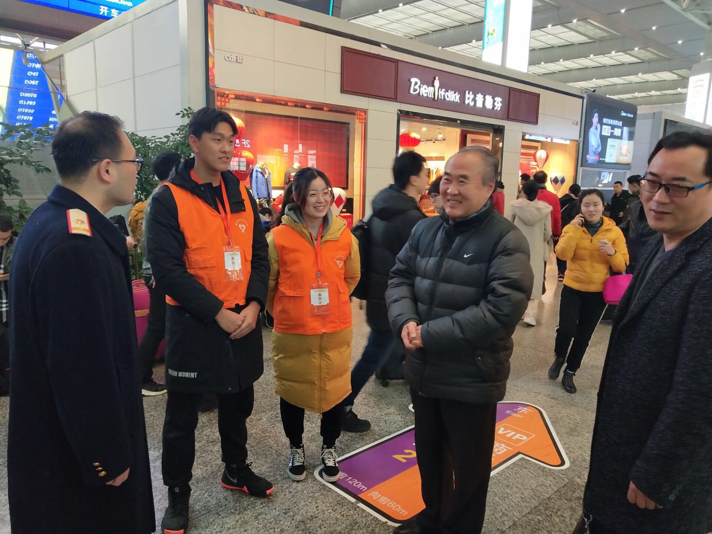 随后,胡晟一行来到学雷锋服务站、问询处、自助售票厅等慰问志愿服务学生。在慰问过程中,胡晟认真了解了他们的服务内容、服务中遇到的困难、服务感受等情况。并对同学们在志愿服务工作中听从指挥、服从安排、坚持不懈、吃苦耐劳的精神给予高度肯定。他希望同学们要坚持弘扬“奉献、友爱、互助、进步”的志愿精神,珍惜志愿服务的机会,在实践工作中体验快乐,在奉献服务中学会分享,不断提升能力、磨砺品质,展示青春风采。最后胡晟向志愿者赠送了慰问品并和大家合影留念。