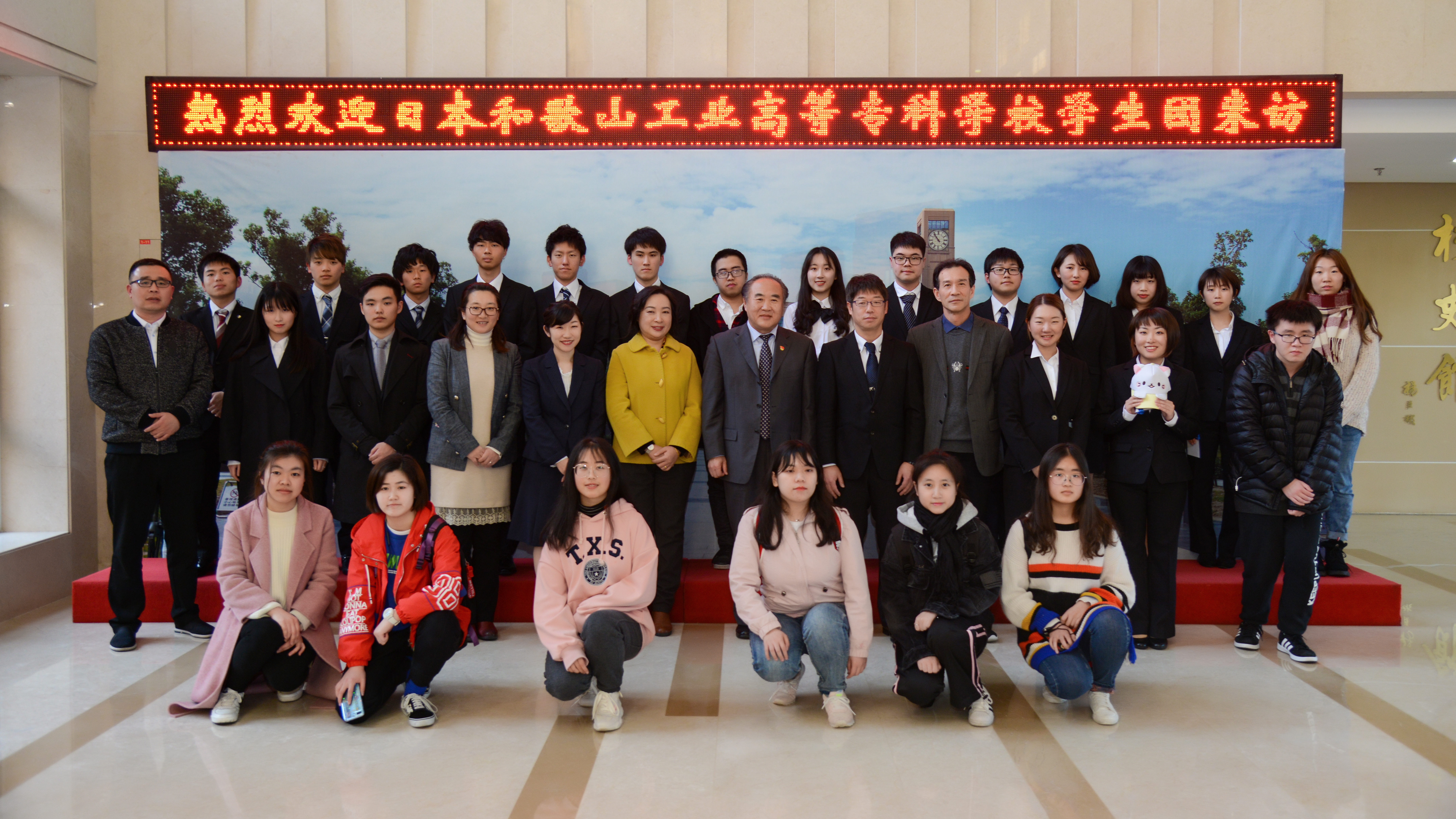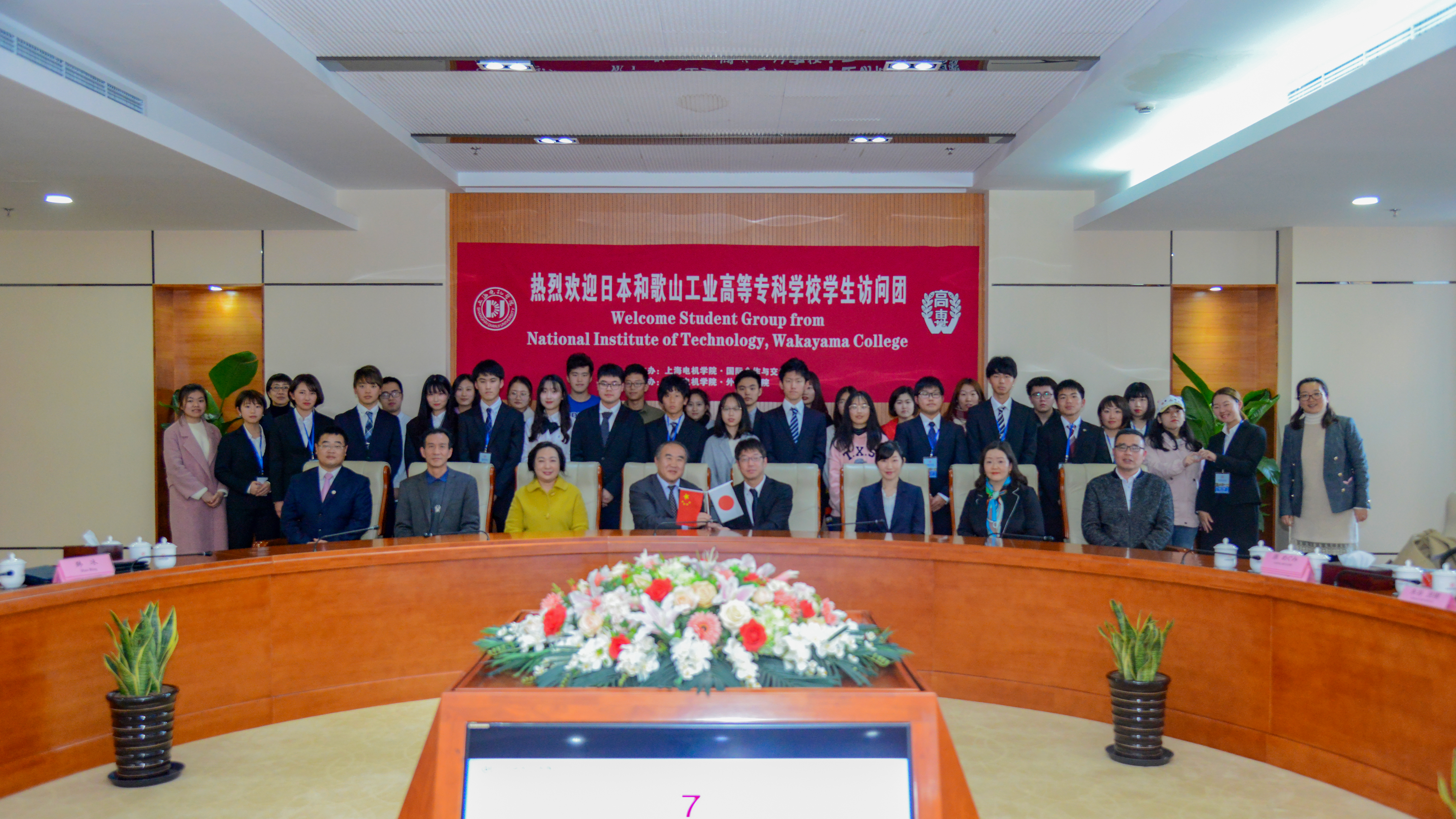 和歌山代表团学生一一进行自我介绍,简单的“初次见面,请多关照”透露日本学生真诚的态度和希望学到更多中国文化的愿望。同时,双方互赠礼物作为彼此友谊的象征。来自机械学院的金宜岷同学曾作为志愿者前往日本和歌山高等专门学校教授日本学生中文,他用流利的日文介绍我校情况及学生活动。作为去年前往日本和歌山高等专门学校的交流生,来自商学院的徐丁嵘同学带着我们回忆了我校师生在日本的整体行程和收获,用中日两种语言交流自己的感受,在座各位都感受到了中日文化之间美好的碰撞。最后双方师生合影留念,此次欢迎仪式圆满结束。