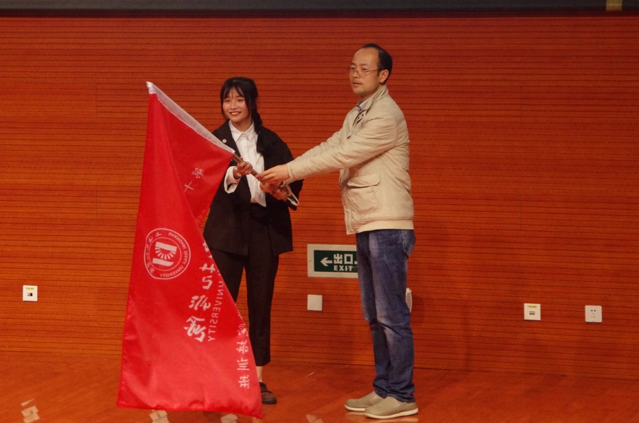 接下来,组织部副部长余卫宁为优青学院学员代表张芯同学授旗,第十一期优青学院正式开班。学员代表新一期优青学院培训班的班长陈元祺同学上台发言,感谢学校为培养新一代青年学生一直创造平台和机会,并就自己的个人经历,说明过去的培训对自身思想素质和工作能力有极大提升,帮助自己迅速的熟悉工作,掌握基本实用技能。但是也深感自己在领导力等方面还有所欠缺,很荣幸能成为第十一期优青学院的学员,他必将全力以赴、全情投入,带领大家创新思维、突破自己、全面提升。