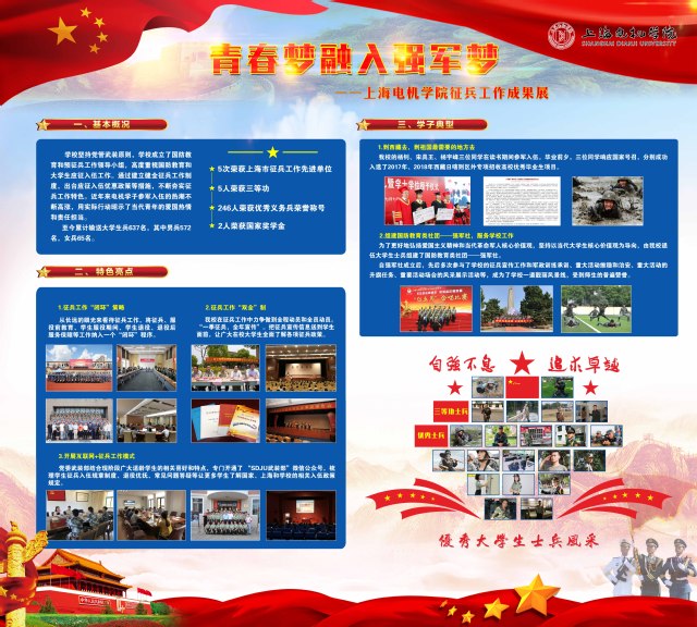据统计,自2006年开始启动大学生征兵工作以来,我校累计向部队输送大学生士兵637名,其中男兵572名,女兵65名。入伍期间先后有5人荣获三等功,2人荣获国家奖学金,246人荣获优秀义务兵荣誉称号。学校先后5次荣获上海市征兵工作先进单位。 (孔祥昆)