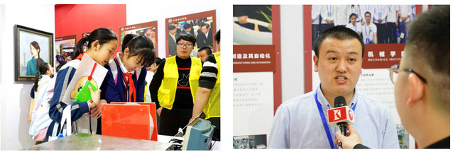 前来招生咨询的家长络绎不绝。家长们跟工作人员询问着学校的相关专业,带走了学校的宣传材料,写下了招生咨询的电话。周六的展区前还有一群特殊的身影,不少教职工带上孩子前来参观学校展区并给参展师生加油点赞。