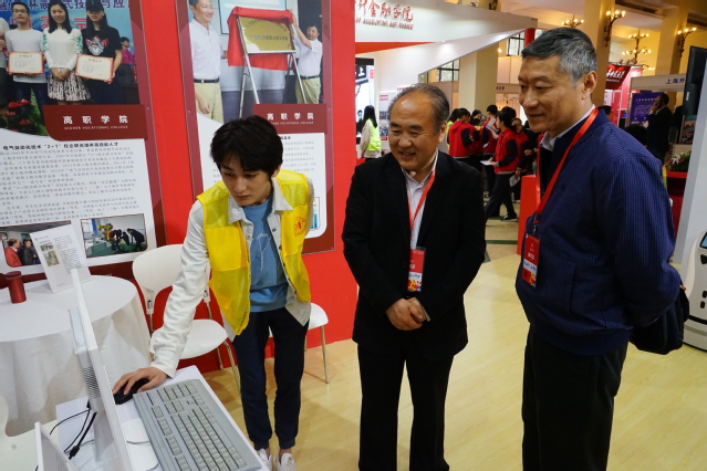 上海市副市长陈群莅临我校展区参观指导并听取了学校近年来人才培养成果及参展项目介绍。上海市教卫工作党委副书记成旦红,上海教育报刊总社社长仲立新,上海市教委高教处、职教处副处长赵坚等领导参观了我校展区。