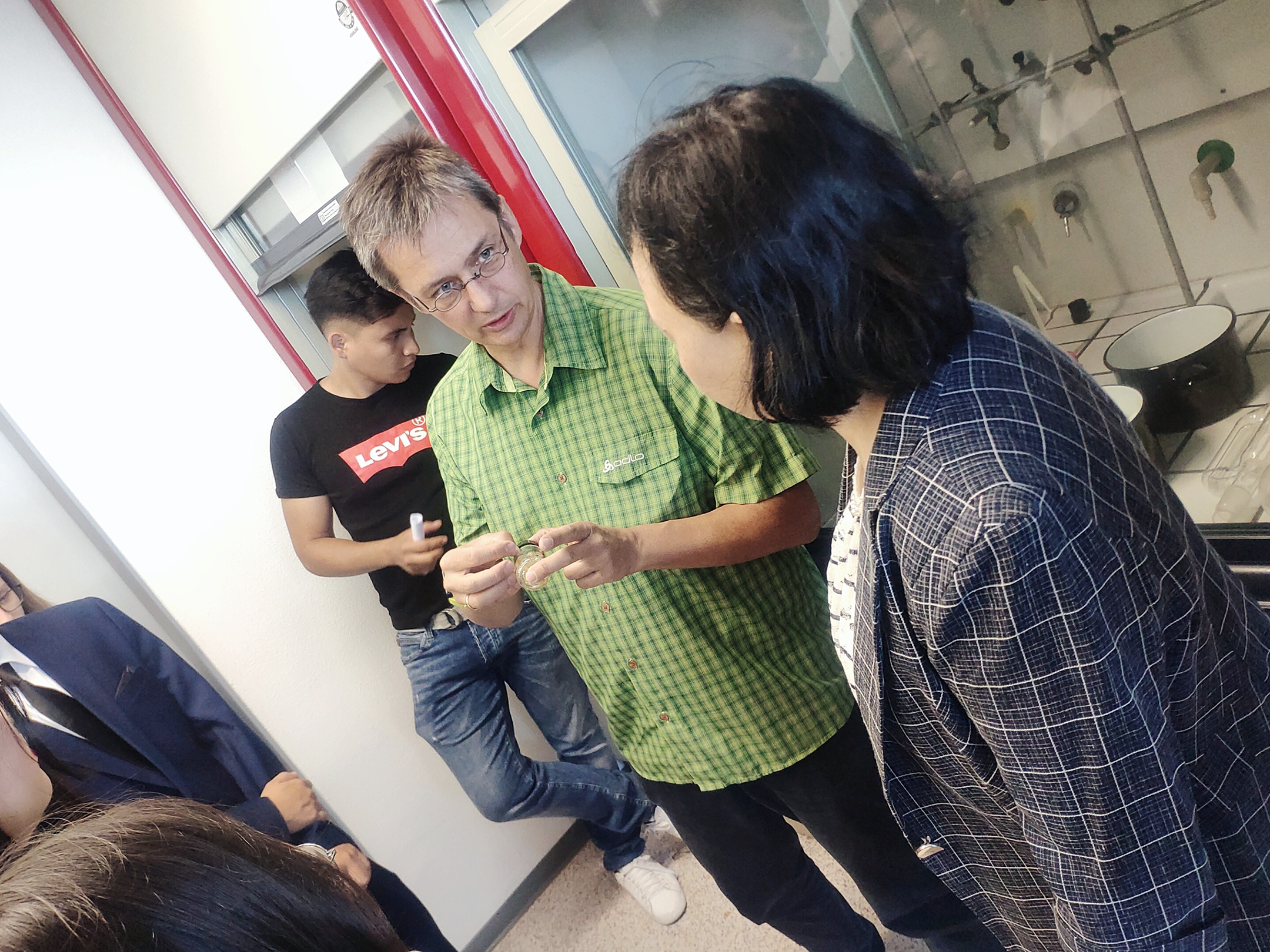 欢迎会结束后,Peetz教授带领交流团的同学们参观了学校的实验室。教授们为学生们详细介绍了学校的物流、化学医药以及纺织及材料实验室并操作机器帮助同学们更直观地感受机器的实际运行模式。