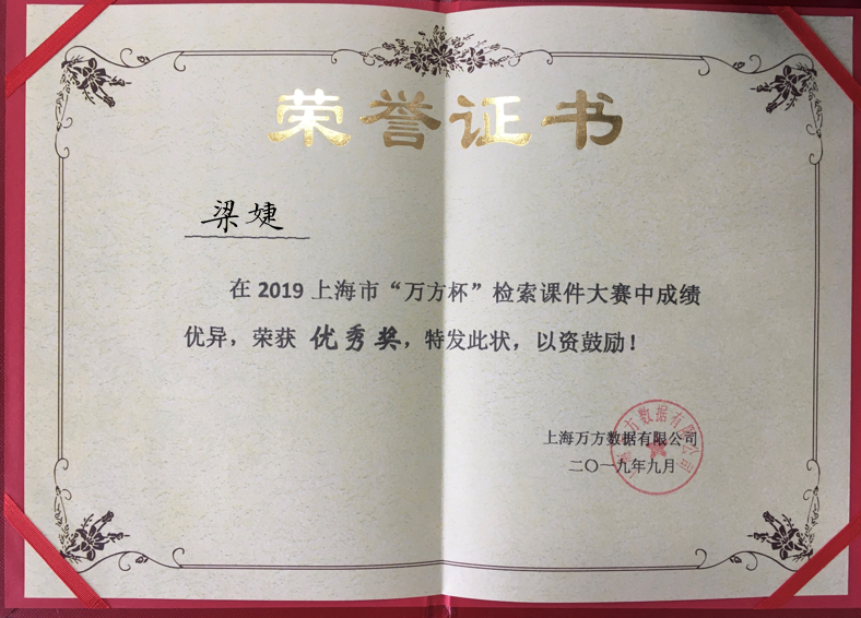 为提高用户的检索信息素养能力,帮助用户更好地了解数字资源及相关平台应用,培养用户总结创新的思辨能力,上海市高等学校图书情报工作委员会与上海万方数据有限公司联合举办2019“万方杯”全国检索课件大赛活动,我校图书馆雷悦、梁婕老师结合利用平时上课的丰富案例,精心准备,首次参赛获得此次大赛的优秀奖。(周航)