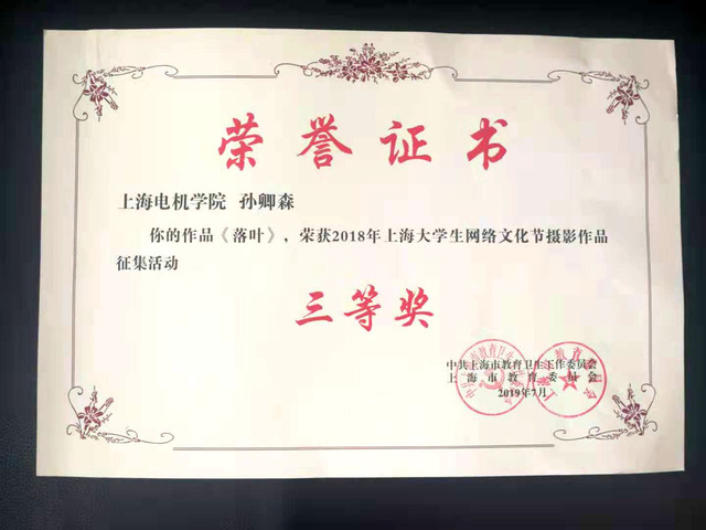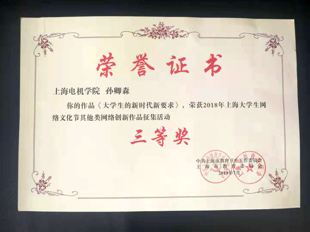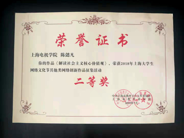 在2018年“上海大学生网络文化节”中,我校学生陈懿凡的作品《解读社会主义核心价值观》荣获二等奖;孙卿森的作品《大学生的新时代新要求》荣获三等奖;同时,孙卿森的作品《落叶》荣获摄影类、其他类网络创新作品三等奖。