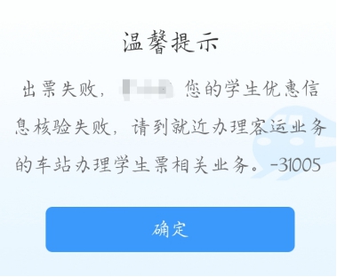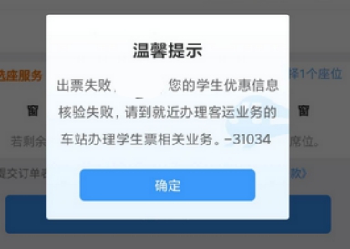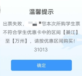 当学生买票在12306买票时提示优惠信息核验失败时(如下图3、图4所示),请学生在资质查询里仔细核查所绑定的优惠区间(如图1所示)是否是正确的站点名称,若发现绑定站点不正确或与实际乘车区间(学校--家庭)不符时,请至学校学生事务中心大厅综合服务窗口修改优惠卡内站名名称,然后去车站自助机刷身份证、优惠卡重新绑定资质信息,重新绑定资质以后12306上资质信息区间修改成功后才可以买票!