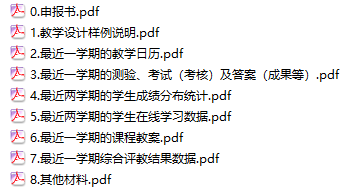2.课程负责人填写相应课程类型的一流本科课程申报书,以及《上海电机学院一流本科课程推荐汇总表》,并向所在二级学院(部、中心)提出申请。电子版申报材料提交要求:申报书及相关附件全部做成PDF文件(签字盖章页须签字和盖章),以目录的形式,做成一个文件夹。形式如下: