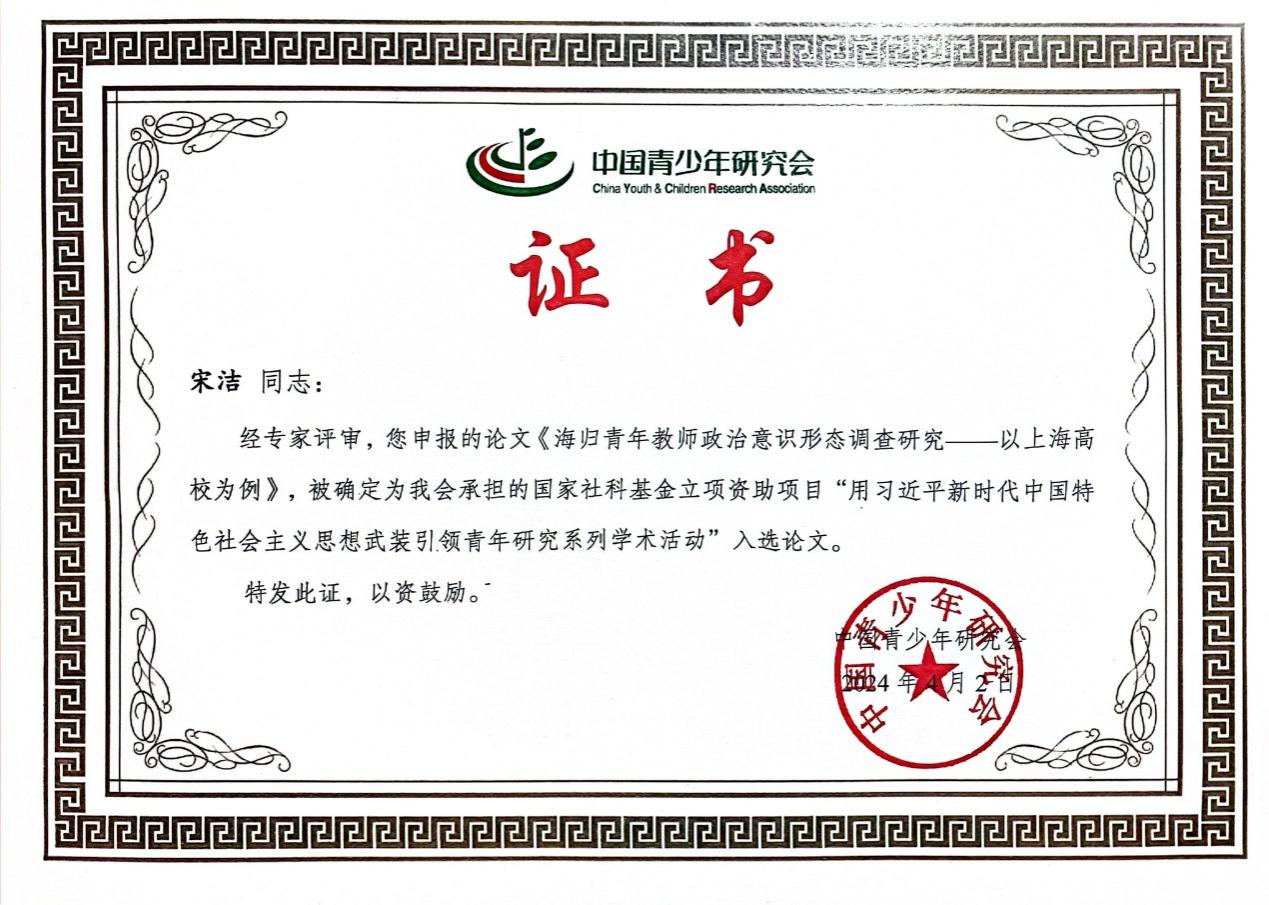近日,中国青少年研究会公布了“用习近平新时代中国特色社会主义思想武装引领青年”研究入选成果,我校马克思主义学院宋洁教授申报的论文《海归青年教师政治意识形态调查研究——以上海高校为例》成功入选。