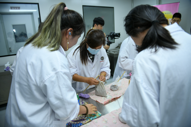 活动最后,师生们走进玉海棠工厂,沉浸式体验“科技+农业”融合成果。在一线深入了解崇明苦草后,同学们亲手参与苦草按摩锤组装,直观感受农产品产业价值,进一步加深对乡村振兴实践的认知。