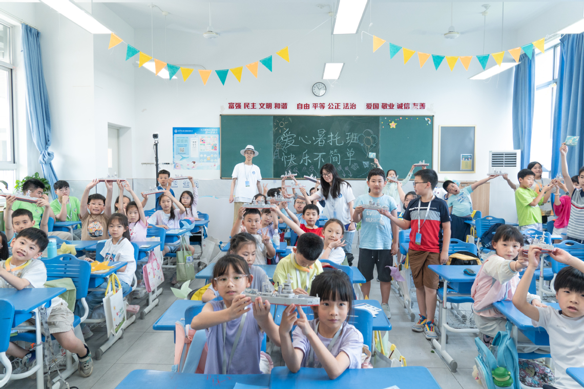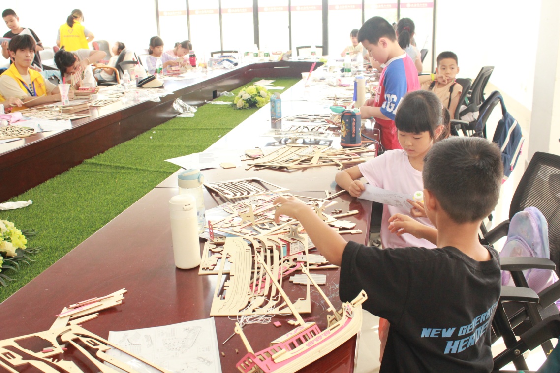 在上海电机学院“大手牵小手”爱心暑托班,实践队开展了传统造船工艺深度体验活动,以中英双语细致解答孩子们关于郑和宝船的疑问,通过三维动画展示郑和宝船的构造。实践队将非遗传统造船技艺简化为适合儿童操作的木质模型,指导完成船身固定、桅杆安装、帆布悬挂。当迷你“郑和宝船”逐渐成型,孩子们脸上洋溢着自豪的笑容。
