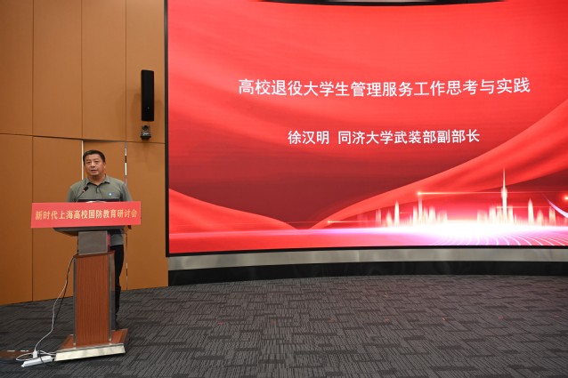 同济大学武装部副部长徐汉明发言主题是《高校退役大学生管理服务工作思考与实践》,基于习近平总书记对退役军人工作的重要指示,系统阐述了 新时代高校退役大学生管理服务工作的重要意义、现状问题及实践对策。同济大学通过建立校院两级领导机 制、制定“一人一策”成长方案、构建“武装部+”协同服务体系、实施全 周期数字化管理等创新实践,有效提升了管理服务的精细化与人性化水平。学校还通过选树典型、开展双创研修、搭建发展平台等方式,助力退役大学生顺利完成角色转换并实现全面发展。