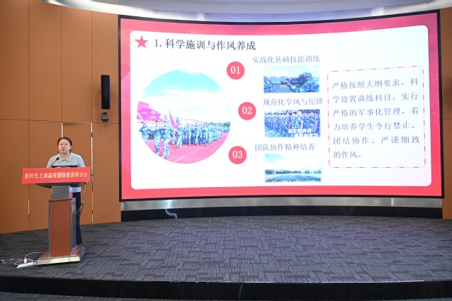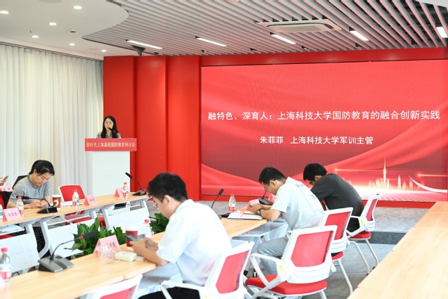 上海科技大学军训主管朱菲菲发言主题是《融特色、深育人:上海科技大学国防教育的融合创新实践》,以上海科技大学国防教育实践为例,分享了特色国防教育与育人深度融合的经验。