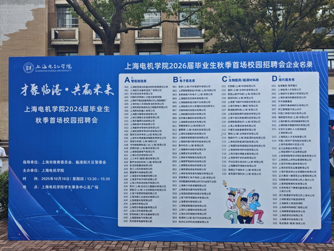 10月16日下午,上海电机学院在学生事务中心及广场成功举办“才聚临港,共赢未来”2026届毕业生秋季首场校园招聘会。本次招聘会汇聚130余家优质企业,提供近500个就业岗位,涵盖智能制造、集成电路、航空航天、能源材料、现代服务等重点领域,用人需求总量超3300人,为毕业生搭建了高效精准的就业对接平台。
