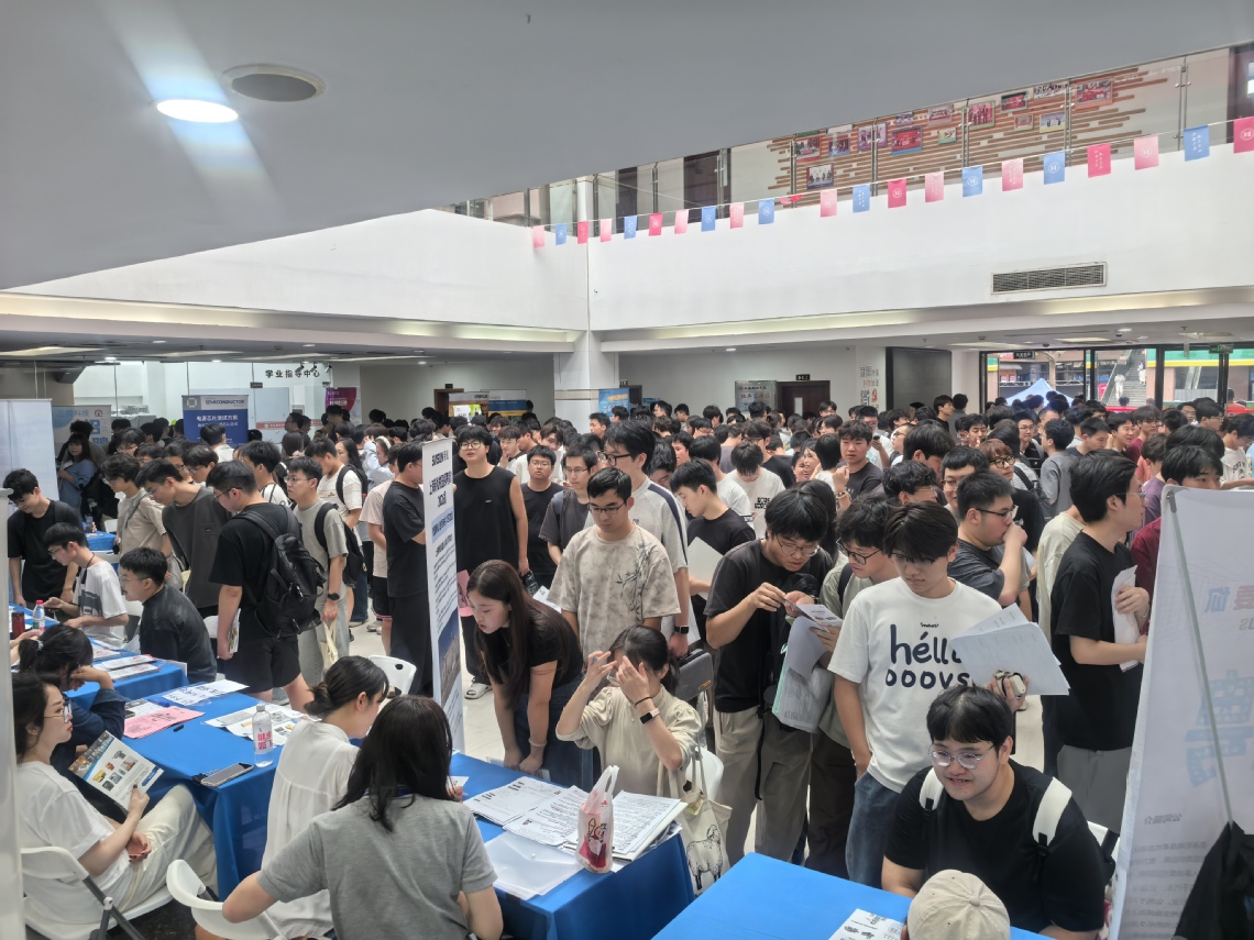 招聘会现场气氛热烈,各企业展位前人流如织。上海航空发动机复合材料有限责任公司、中国科学院微小卫星创新研究院、上海电气电站设备有限公司等高端制造企业受到学子广泛关注;宇量昇科技、新微半导体、日荣半导体等集成电路类企业带来大量技术研发岗位;派能能源、卡倍亿新能源、康恒环境等能源材料企业展现了绿色科技领域就业新方向;临港集团、上海申通地铁、工商银行等现代服务企业则提供了多元化的职业发展路径。