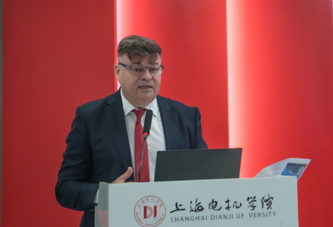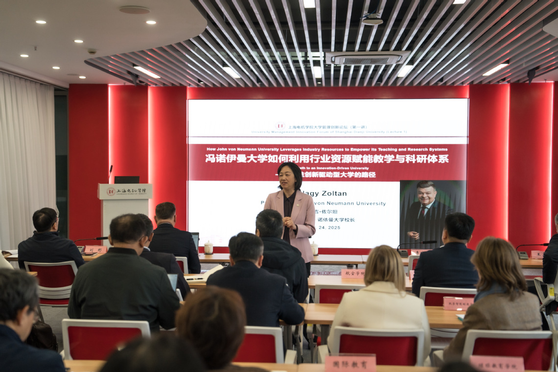 11月24日,上海电机学院成功举办大学管理创新论坛,聚焦应用型高校治理模式创新与教育教学改革。论坛特邀匈牙利约翰·冯·诺伊曼大学校长Nagy Zoltan、Attila Kiss等一行四人来访,并由Nagy Zoltan校长作主题报告,分享该校在产教融合、数字化转型与创新驱动发展方面的先进经验。论坛由副院长杨俊杰主持,院长龚思怡、学校中层领导干部及教师代表参加。