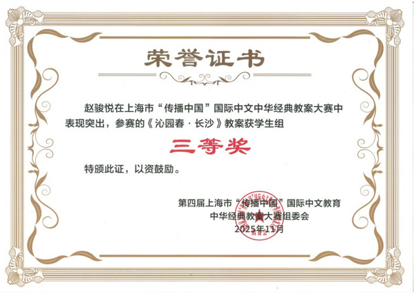 近日,上海市“传播中国”国际中文教育中华经典教案大赛传来喜讯,国际教育学院国际中文教育硕士研究生赵骏悦凭借扎实的专业能力与创新的教学设计,荣获三等奖,充分彰显了我校国际中文教育专业的人才培养质量与教学实践创新实力。