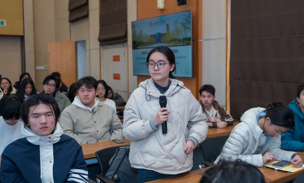 互动提问环节气氛热烈,师生代表聚焦国际人才战略、合作发展方向、跨文化适应等关键问题踊跃发问,提出“外国留学生对德国科技经济发展的价值”“中德合作项目未来重点突破领域”“大学生如何提升跨文化交流能力”“人工智能技术在学业与课余生活中的应用”等兼具深度与现实意义的问题,充分展现了我校师生对中德合作领域的密切关注与深入思考。孔有为(Uwe Koch)对师生的积极参与和高质量提问给予高度评价,他结合自身丰富的外交实践经验与专业洞察,逐一进行细致解答,提出了兼具指导性与操作性的建议。