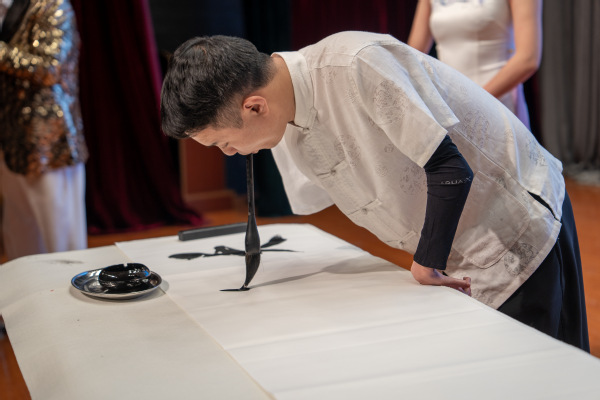 (以口代笔、挥毫泼墨,笔锋遒劲、气韵天成,精湛的技艺引得全场赞叹不已。)