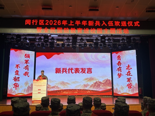 欢送仪式在庄重热烈的氛围中举行。闵行区副区长孙文杰等相关领导、我校党委武装部以及在闵其他高校代表、新兵家长共同见证这一光荣时刻。身着戎装的新兵们精神抖擞、整装待发,现场气氛庄严而温暖。
