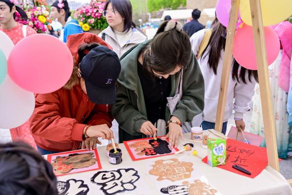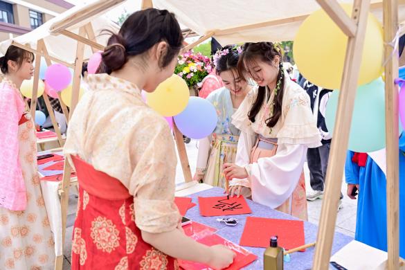 八大沉浸式体验区人头攒动,华裳礼韵阁内,雅致华服与传统妆造体验,直观展现中华文化底蕴与温度;非遗载体之下,漆扇绘制、金石拓印、剪纸DIY等项目有序开展,参与者亲手创作扇面、拓印吉祥纹样、剪裁灵动窗花,留存文化体验印记;以雅趣为桥,投壶、猜谜、书法、春日簪花等互动精彩纷呈,中外青年于投壶间体悟古代礼仪文化,于猜谜中知晓传统民俗,于挥毫间书写中文姓名与福字,感受笔墨丹青之韵,撷取花草簪于发间,珍藏春日浪漫与文化诗意。